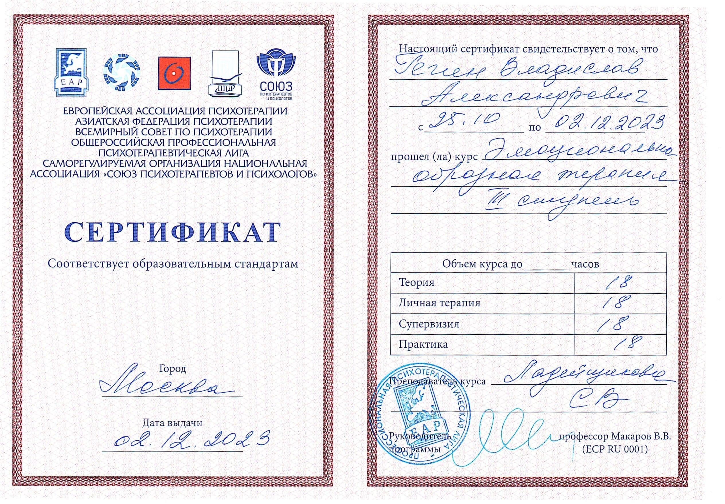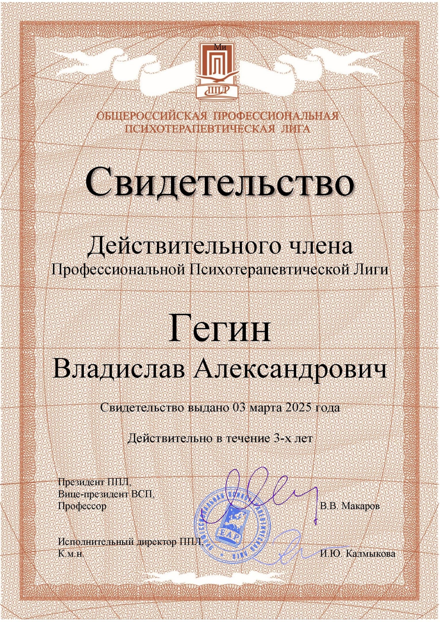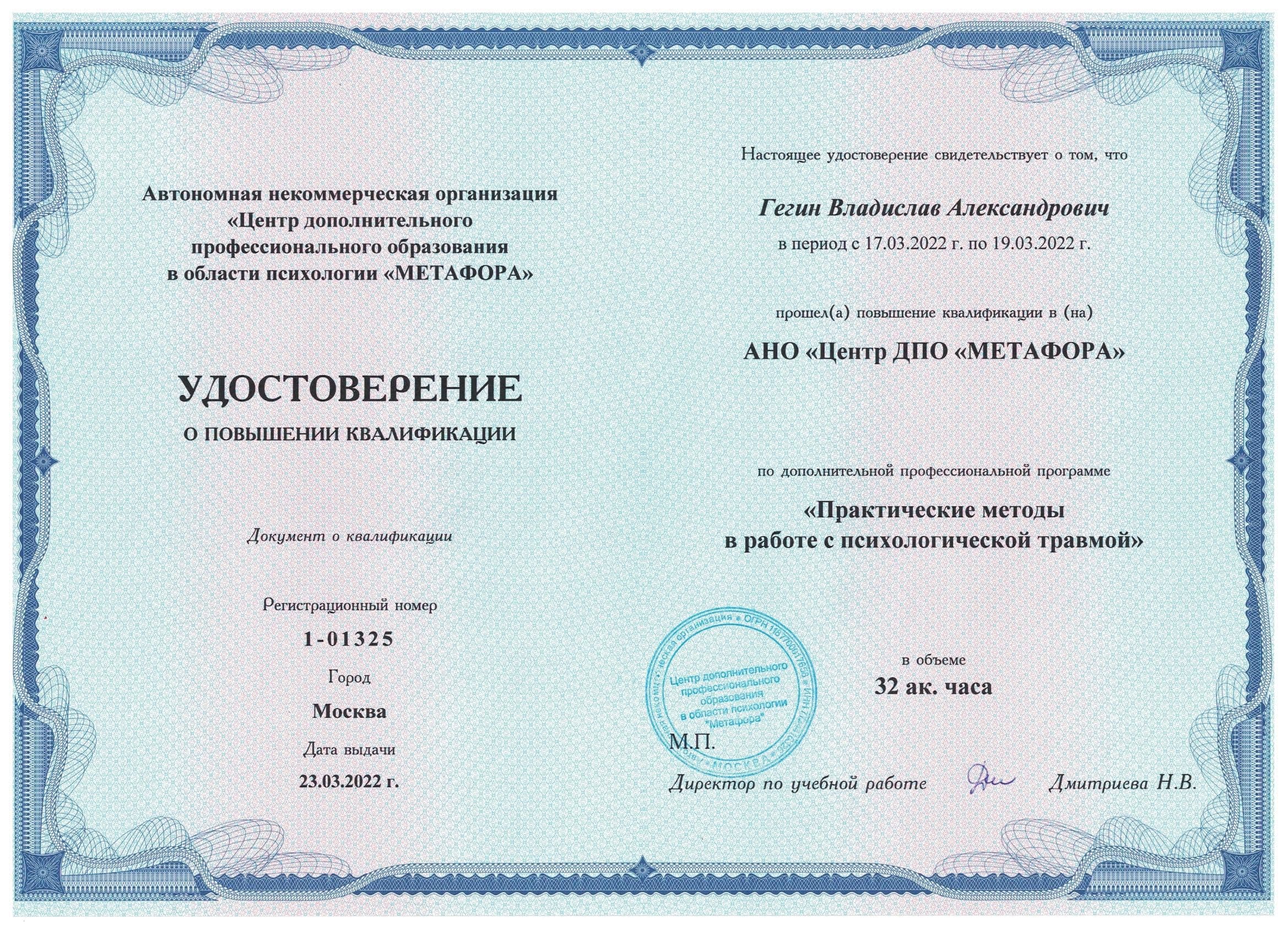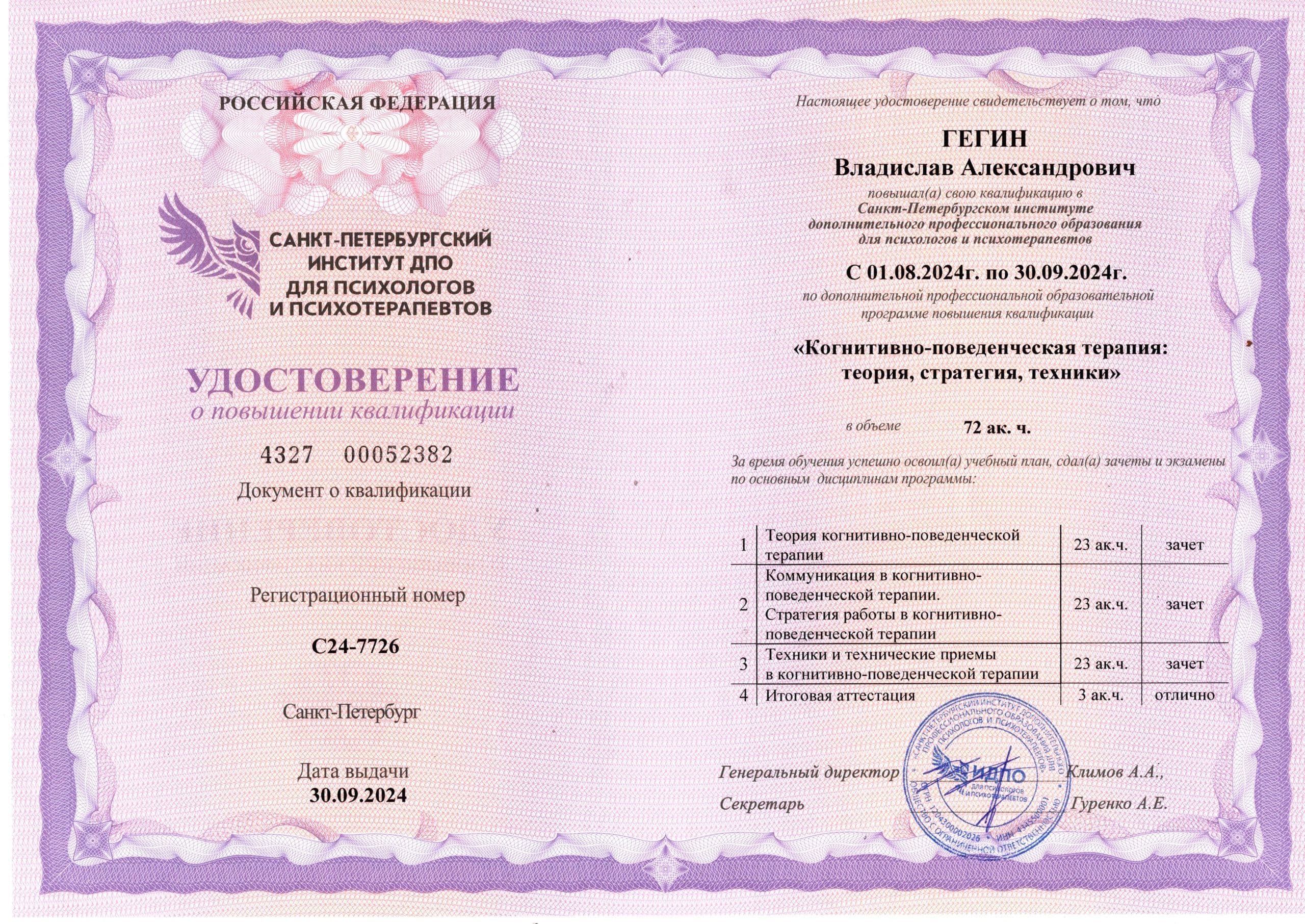 В 2020 году я завершил обучение в Санкт-Петербургском военном ордена Жукова институте войск национальной гвардии Российской Федерации по специальности «Психология служебной деятельности». С тех пор я активно работаю как психолог в области психотерапии, помогая людям справляться с различными жизненными трудностями.